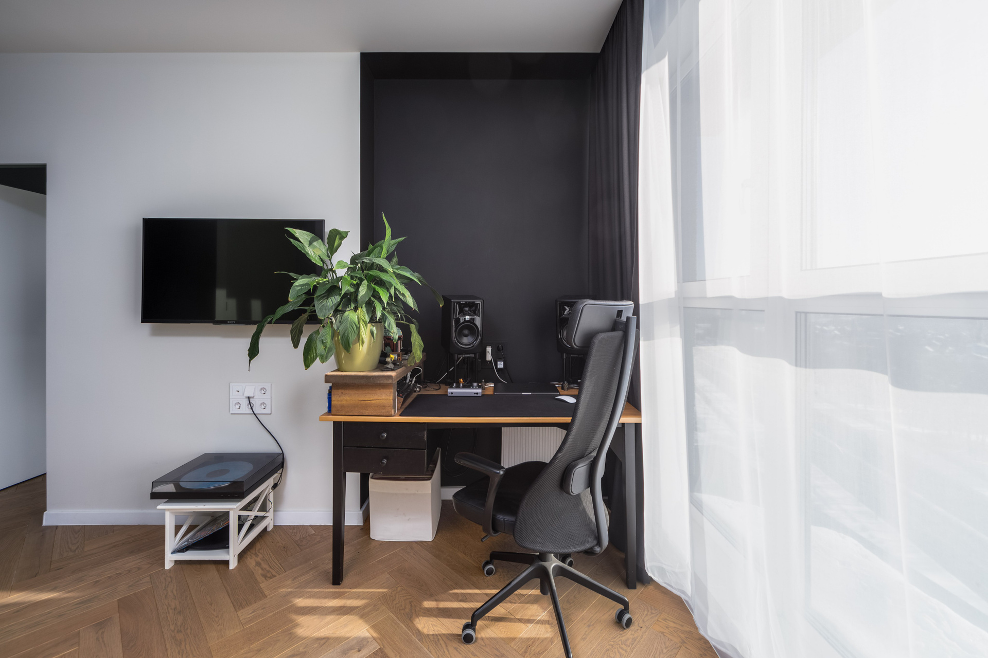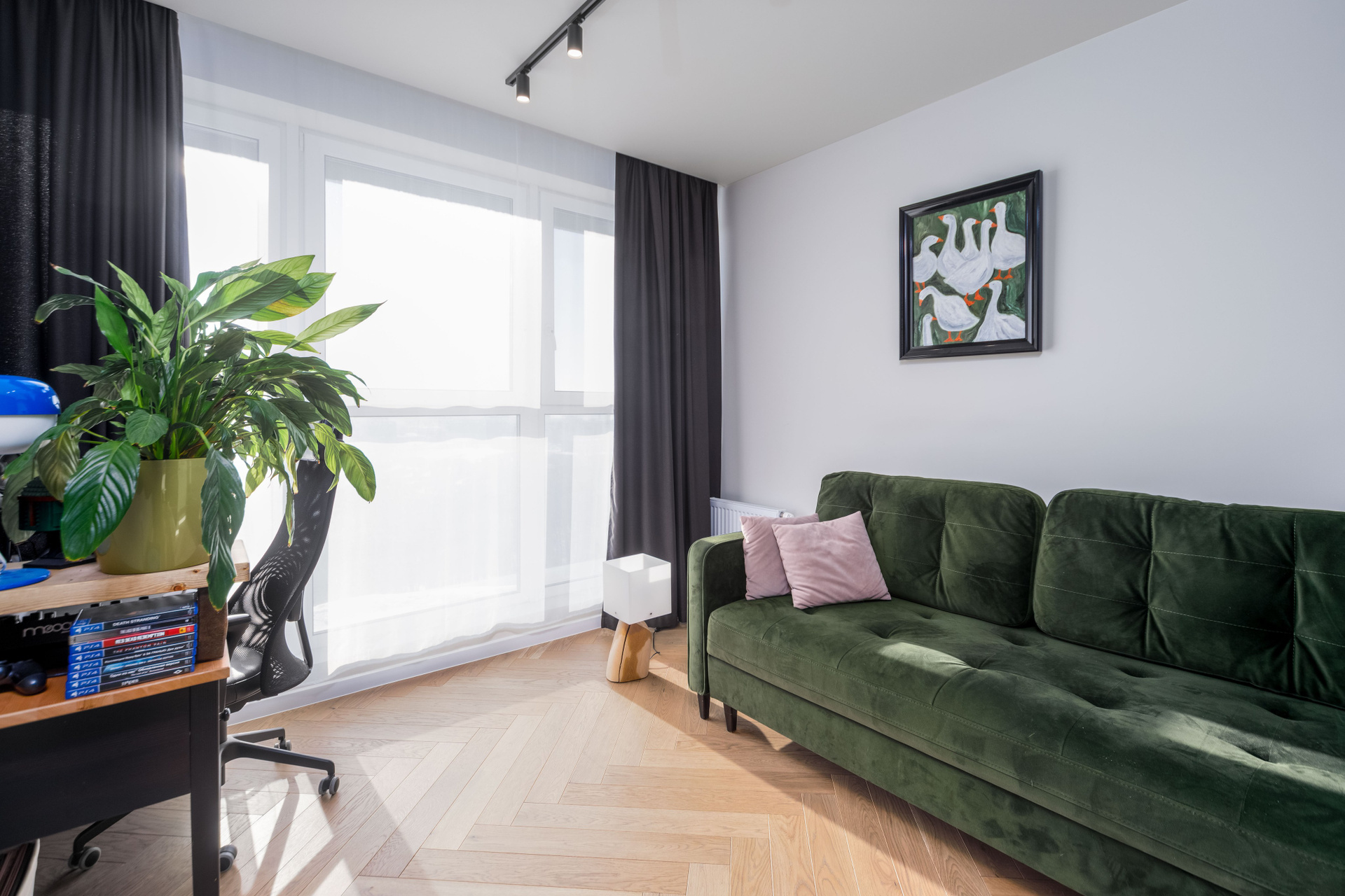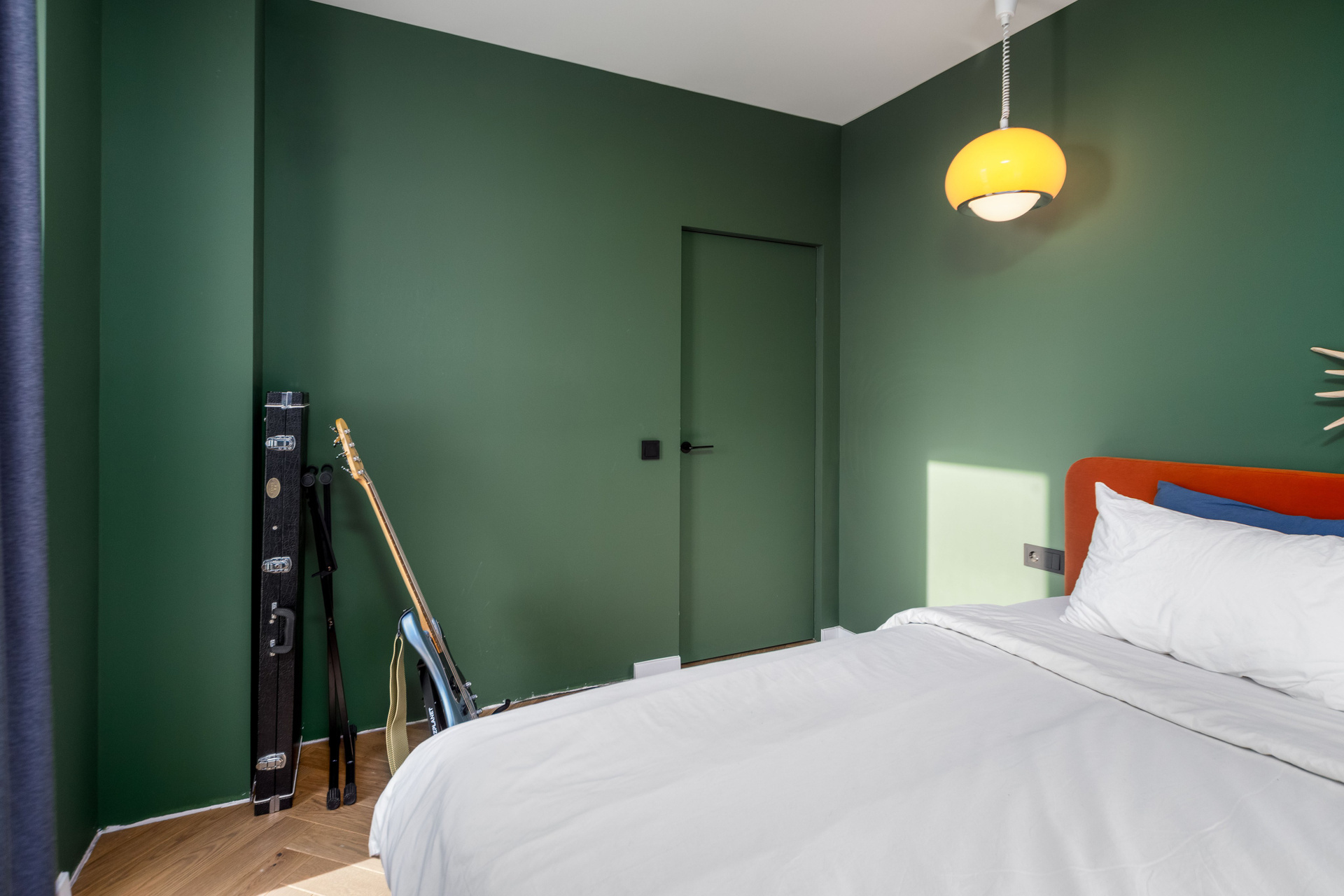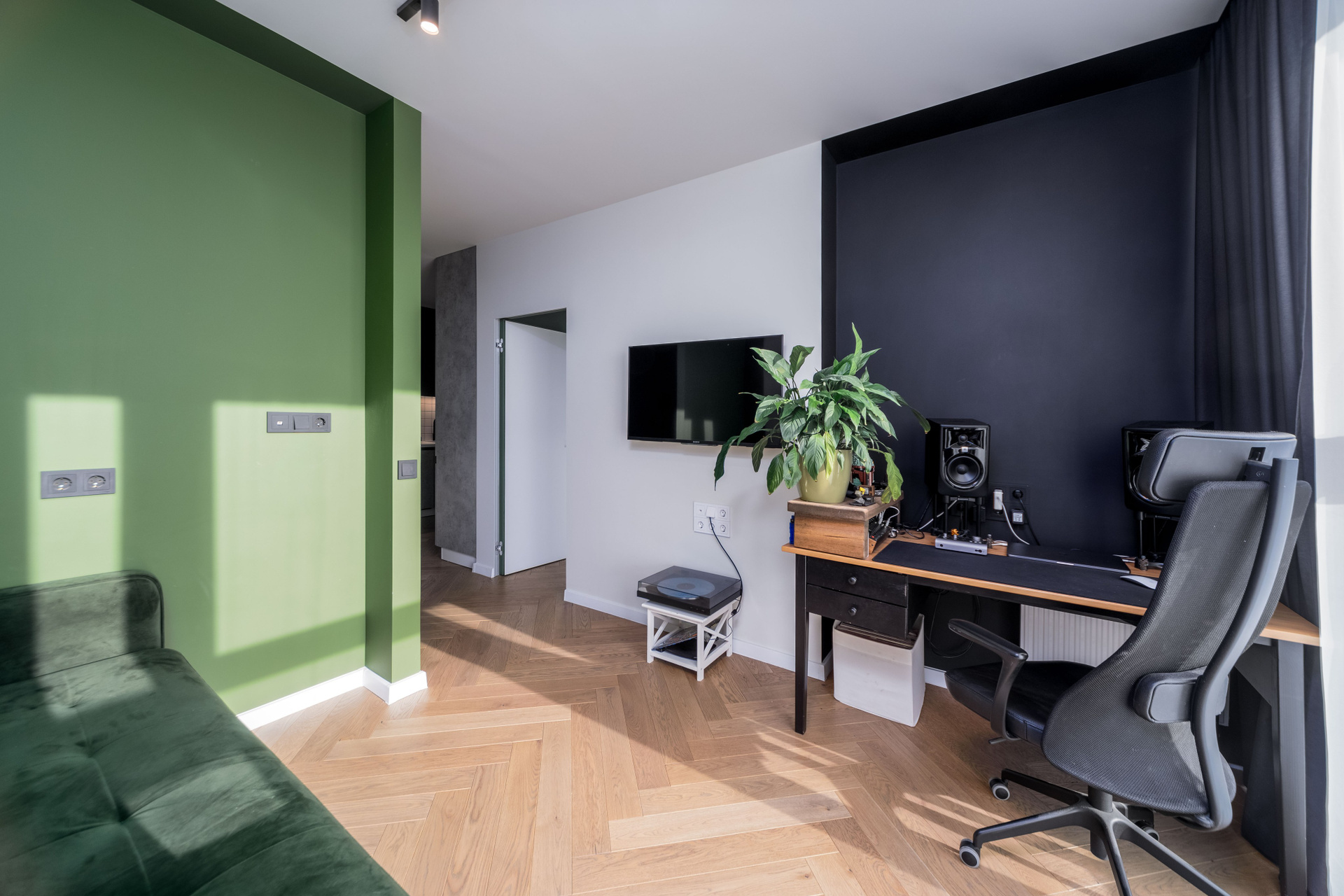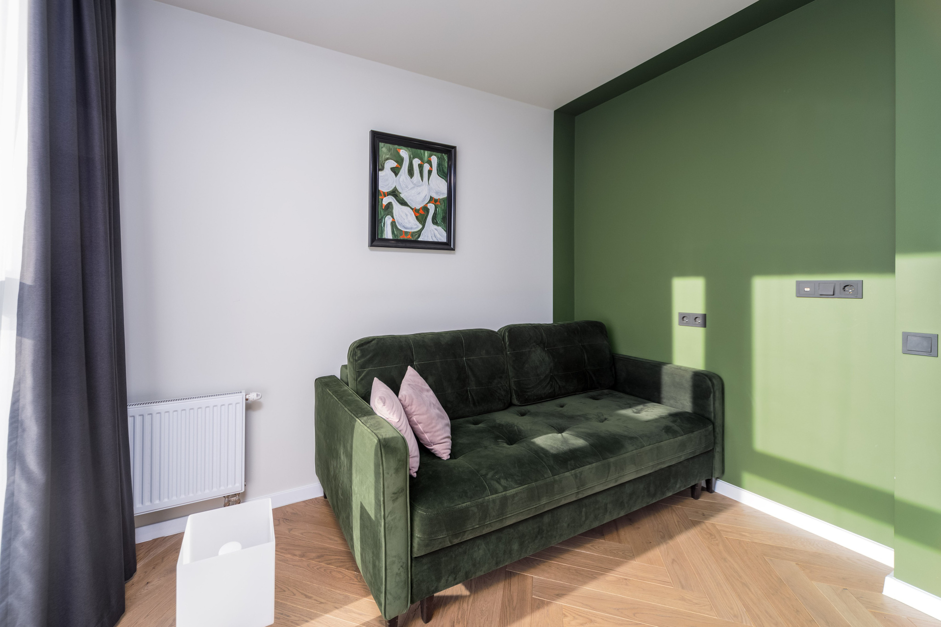 - Полы — паркетная доска и плитка. Стены окрашены.