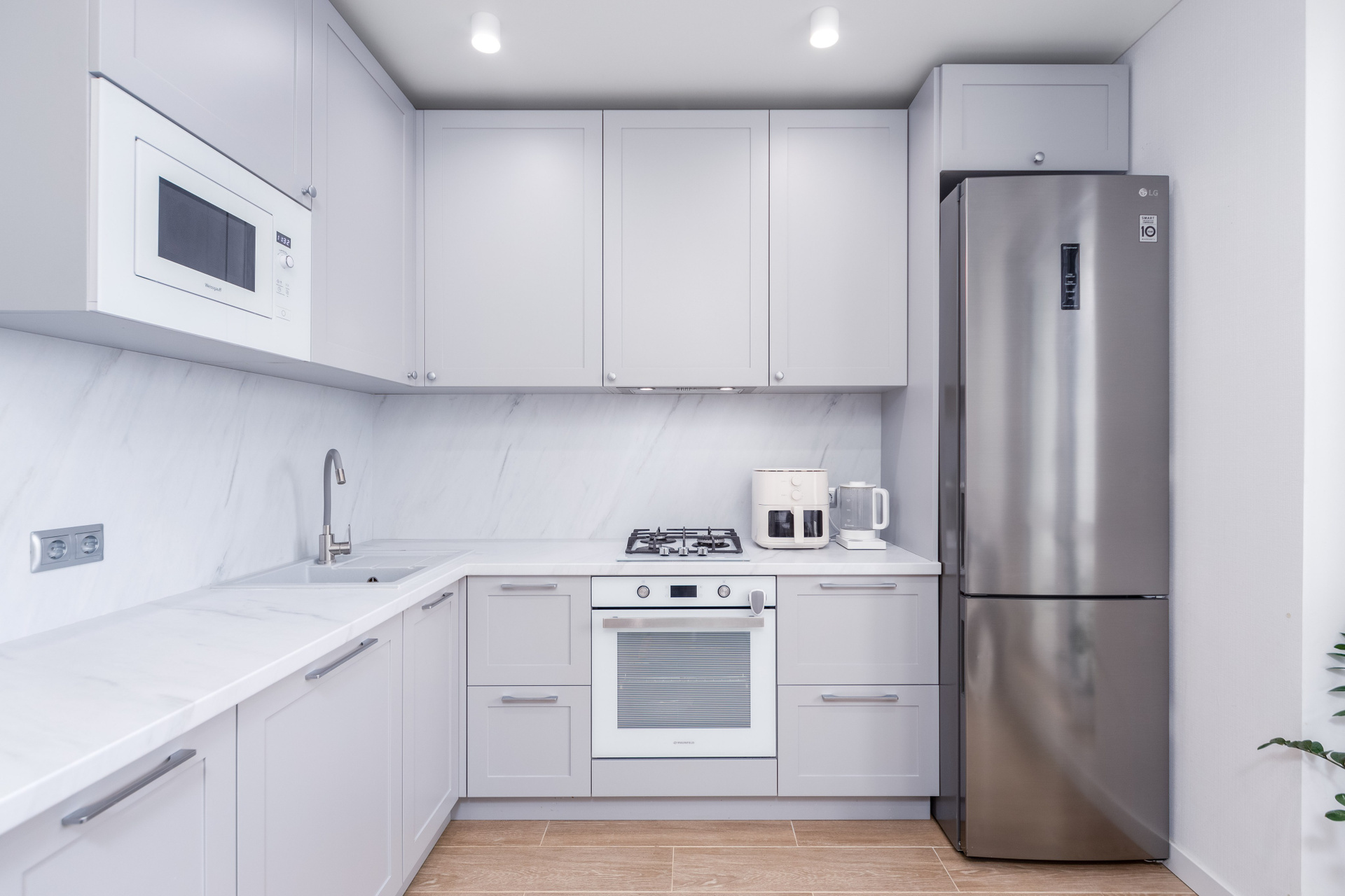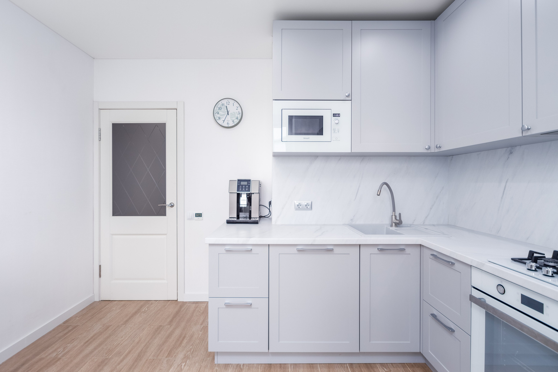 Встроенная кухня устанавливалась на заказ, по индивидуальному проекту и укомплектована всей необходимой бытовой техникой: